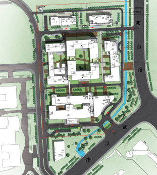 规划方案通过三条东西向的车行道路将场地分为医疗区、康复区、健康区三个部分。中心的主入口设置在武汉路一侧,直接与包含老年病医院、健康管理中心的医疗区相对,到访车辆可按照预设机动车流线快速到达入口大厅门前,下客后快速离开或驶入地下停车库,避免不必要的绕行,减少与步行流线的相互干扰。医疗区与康复区之间的道路作为基地内的次级道路,而功能更加外向的健康区的道路与市政道路直接连通,用以保证产后康复中心和专家会议楼的独立运营。