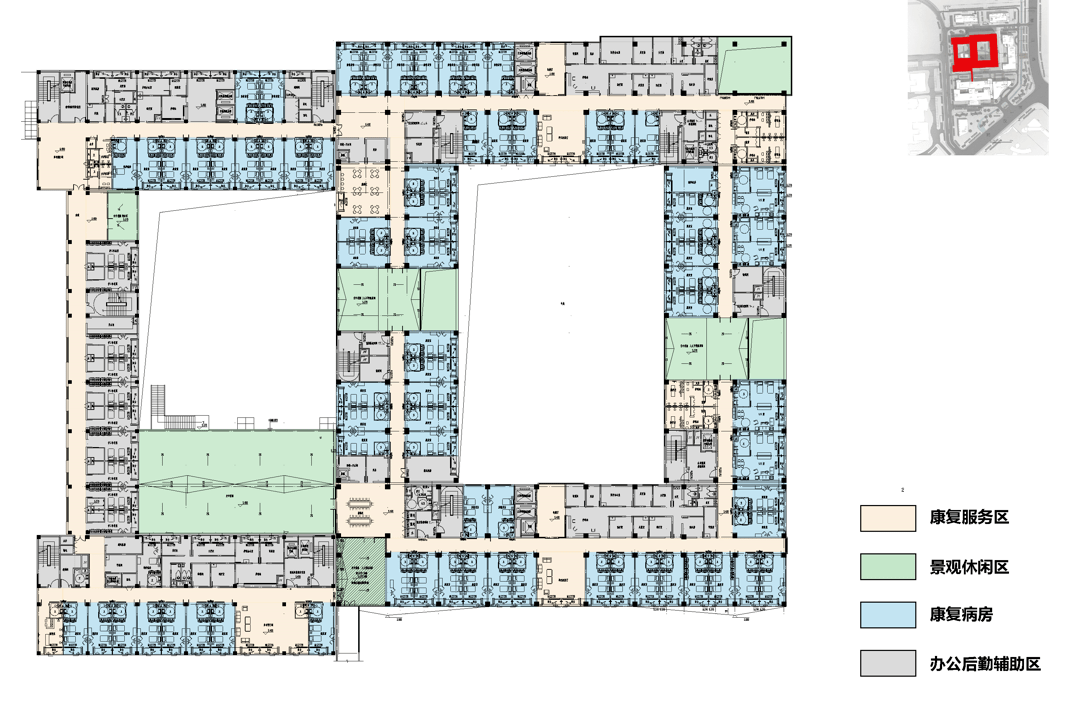 南侧医疗区的康复中心一层以医疗街为中轴线,依次连接门诊主入口挂号大厅、门诊大厅及北侧的医技中心。轴线东西两侧分别布置了康复医疗中心的部分功能与国医馆;康复中心二层为门诊与检验区域;三层为 ICU、静配中心与内镜中心;四层至六层为康复中心住院部。住院部是康复中心设计的重点,设计方案采用了将小节点串联成大组团的方式,在确保每个护理单元的医疗效率的同时,让住院患者与医务工作者能够体验到变化丰富且功能多样的公共活动空间。